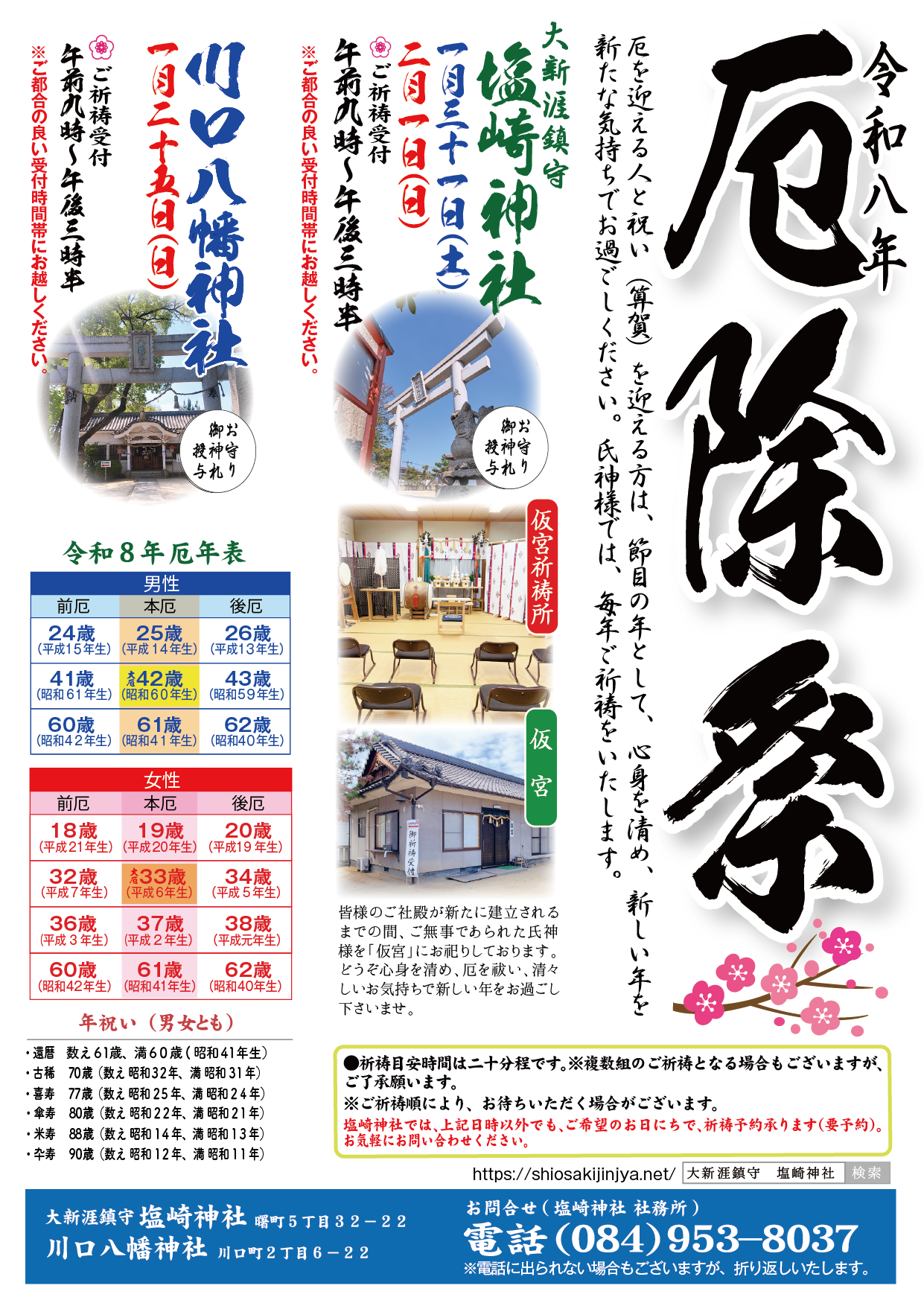 お知らせ 2026年01月07日 令和八年 塩崎神社 厄除祈願祭のお知らせ 令和8年が始まり、地域の皆様におかれまし… 続きを読む 2025年12月22日 令和八年 塩崎神社・川口八幡神社 初詣について ■令和八年の初詣について … 続きを読む 2025年10月13日 大新涯鎮守 曙町・塩崎神社【七五三祈願予約受付中】氏神様で七五三 【七五三祈願予約受付中】 … 続きを読む 1 2 3 4 5 … 14 Next »